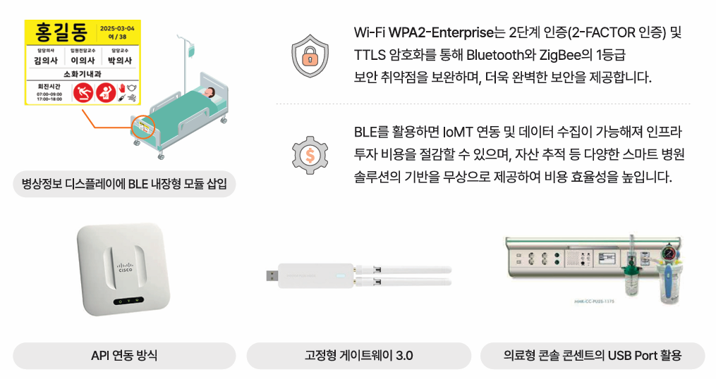 마지막으로, IoMT 기반의 End-to-End 데이터 연계 구조는 병상 정보, 위치 정보, 생체신호는 물론, EMR/HIS 등 병원 핵심 시스템과의 데이터 흐름까지 완전하게 통합합니다. 이는 병원별 인프라 환경 차이에 따른 호환성 문제를 최소화하고, 의료진이 환자 상태와 자원 현황을 실시간으로 파악하며 병원 전체가 하나의 통합 디지털 네트워크로 작동하게 하는 핵심입니다.